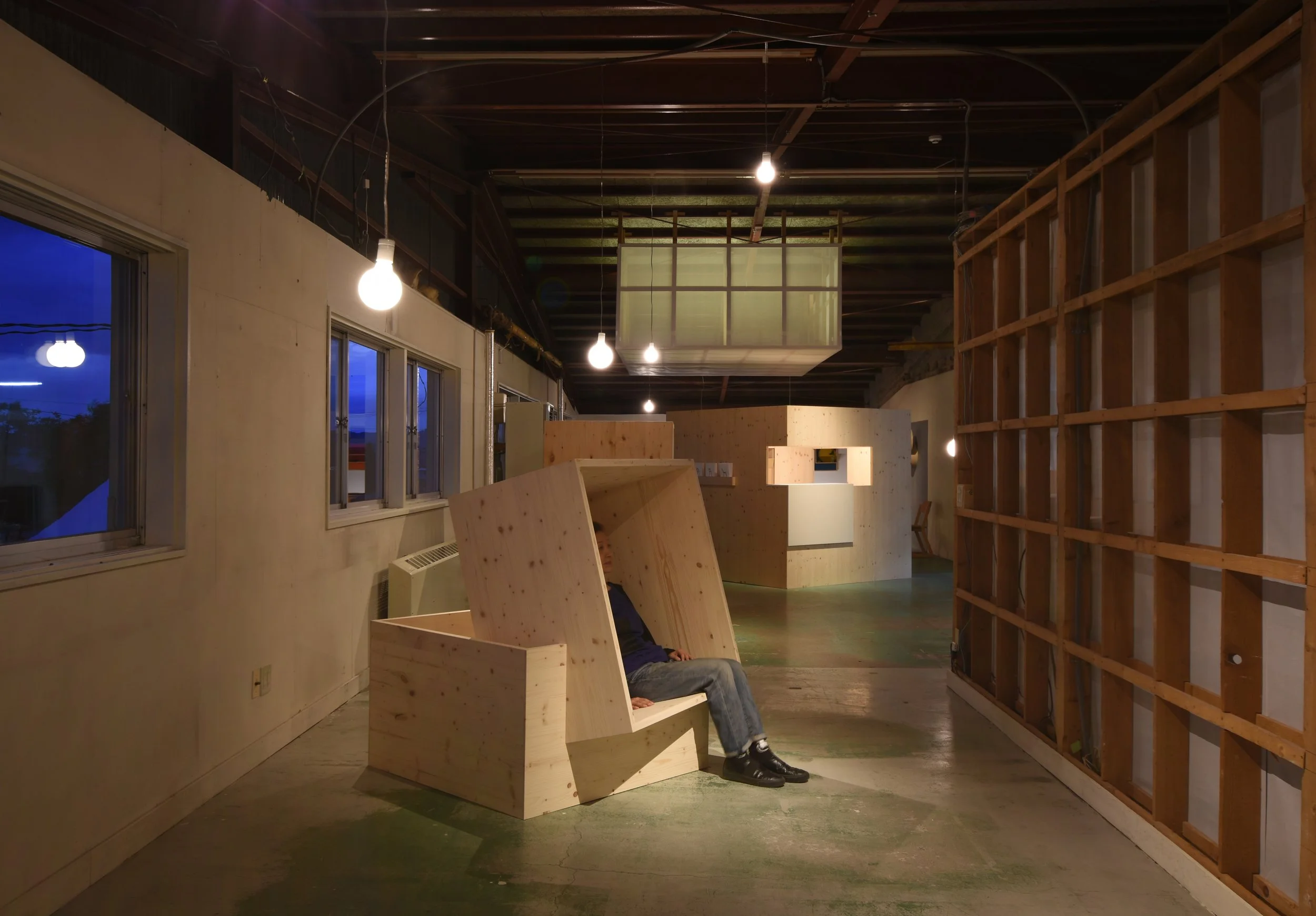 A series of box-shaped furniture pieces exhibited in 2019, designed for people to sit inside.